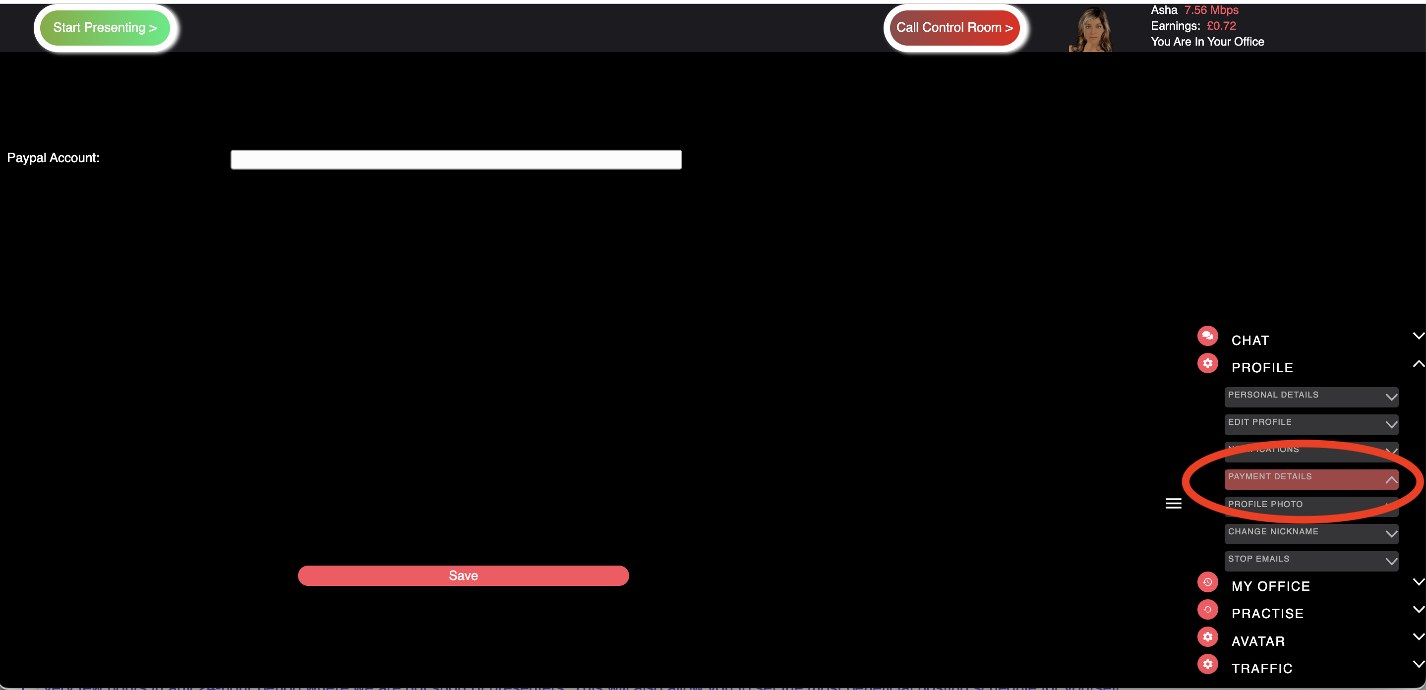 You can enter your Paypal details by clicking on 'Presenter Area' and then 'Profile'
